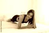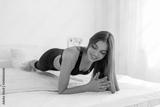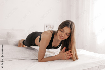 Pretty girl doing yoga exercise on bed at home. Healthy and sport lifestyle.