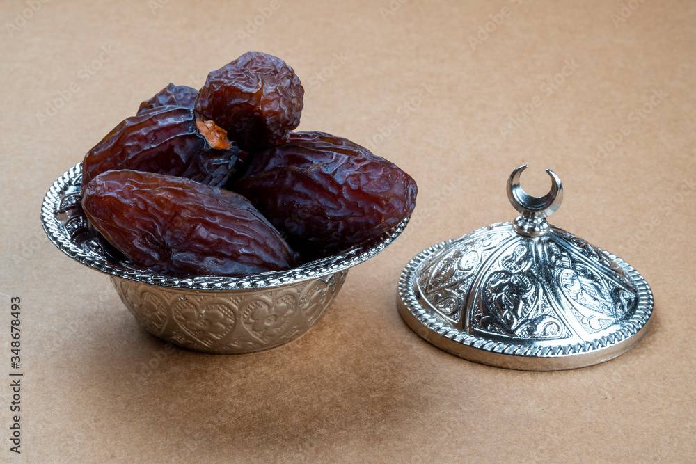 Religious iftar Ramadan concept: close up of few dried organic sweet date fruits in a silver traditional bowl with ornate half moon cap on brown background for Muslim fasting break.