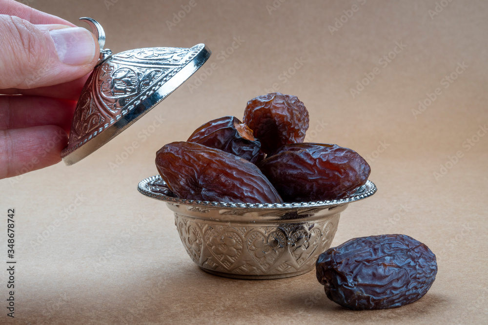Religious iftar ramadan concept: Close up of few dried organic sweet date fruits in a silver traditional bowl. Hand holding ornate cap on brown background for muslim fasting break.