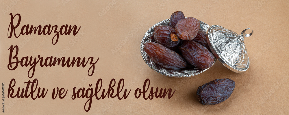 Religious ramadan concept: Few dried organic sweet date fruits in a silver traditional bowl with ornate cap on brown background for fasting break called iftar. Text celebrating in Turkish holidays