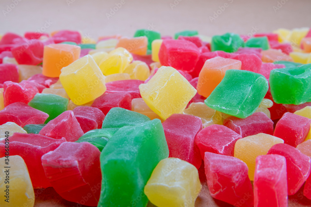 Many cubes shaped soft jelly like sweet traditional Turkish delight (lokum) confectionery in red, green, yellow orange colours and various tastes. Candy treats