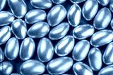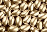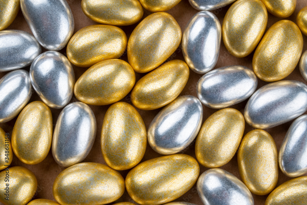 Top view of flat layered gold and silver glazed luxury almond candies for special event treats. Sweet confections for textured background and copy space