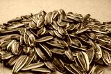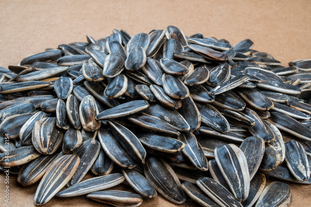 Macro and close up of many stacked organic nutritious sunflower seed kernels in black with white stripes as natural texture background and copy space