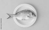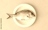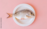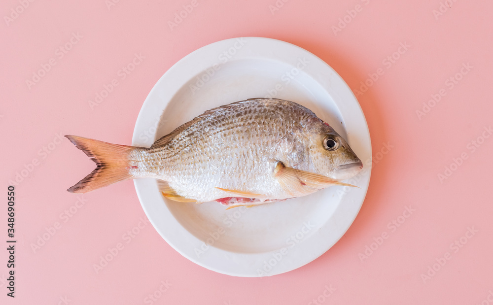 High angle view of fresh yellowfin bream fish on white plate against pink background