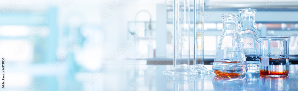water and orange solution in glass flask and cylinder in soft blue light medical science laboratory banner background