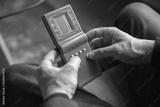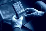 Portrait of senior man with retro toys, meeting things from the past and having fun, exploring the lifestyle of the nineties. Explores past entertainment of the nineties. Comparison of generation.