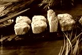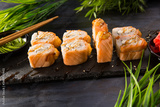 Set of baked sushi rolls with wasabi and ginger on a black background. Japanese oriental cuisine