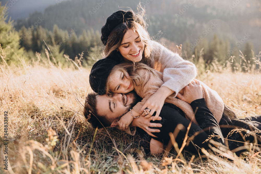 Stylish young family in the autumn mountains. A guy and a girl with their daughter lie and cuddle on the grass against the background of the forest and mountain peaks at sunset.