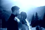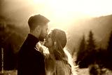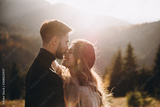 Stylish model couple in the autumn mountains. A young guy and a girl hug and kiss on a background of a forest and mountain peaks at sunset.