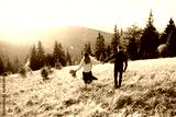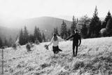 Stylish model couple in the autumn mountains. A young guy and a girl run along the slope against the background of the forest and mountain peaks at sunset. Girl holds in her hands a bouquet of flowers