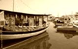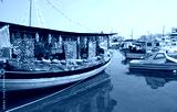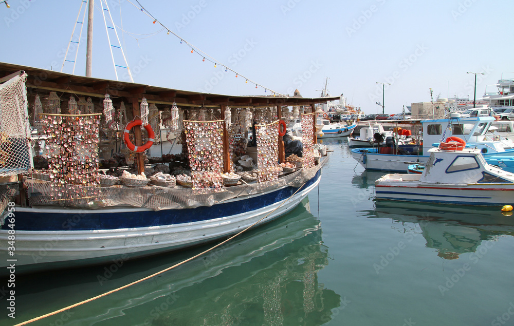 Sale of sponges and shells from a fishing boat in the port of Rhodes, Greece