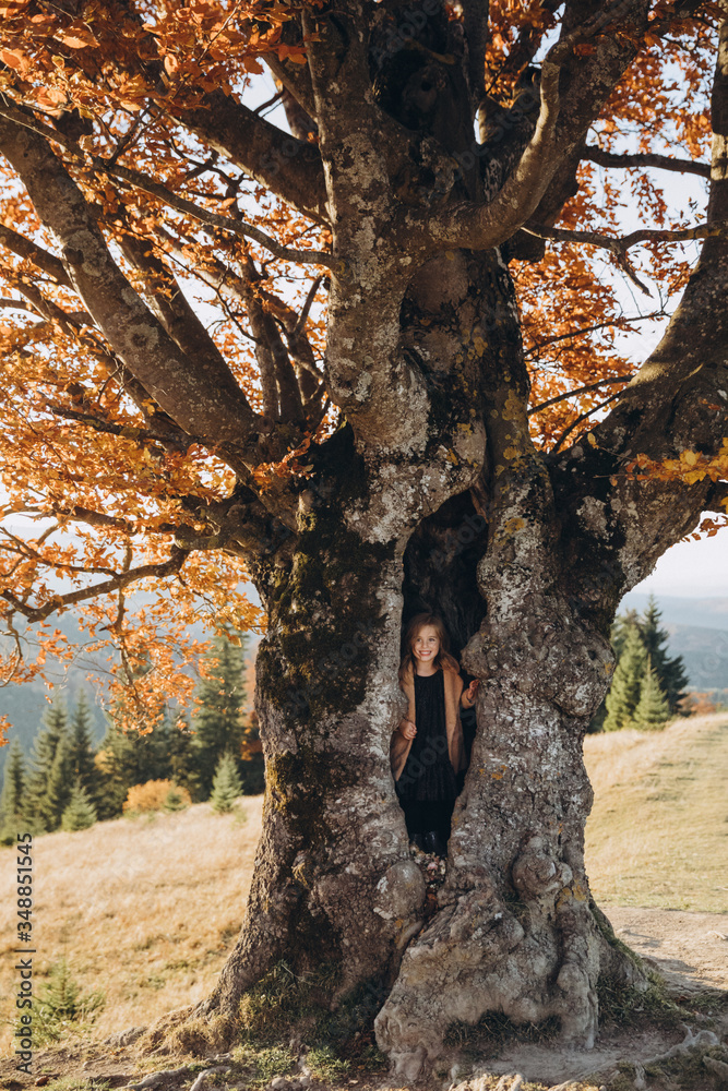 Portrait of a small stylish beautiful model girl who stands in the hollow of a large old tree on a background of autumn mountains