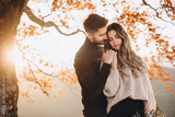 Stylish young couple in the autumn mountains. A guy and a girl stand together under a big old tree against the background of a forest and mountain peaks at sunset. The girl has a bouquet in her hands