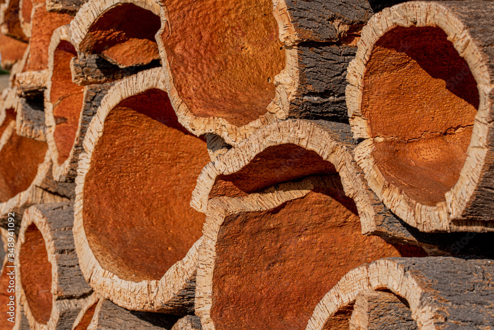 Collecting cork tree bark, stacked outdoors