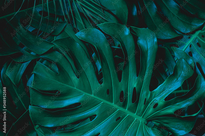closeup nature view of green monstera leaf background. Flat lay, dark nature concept, tropical leaf