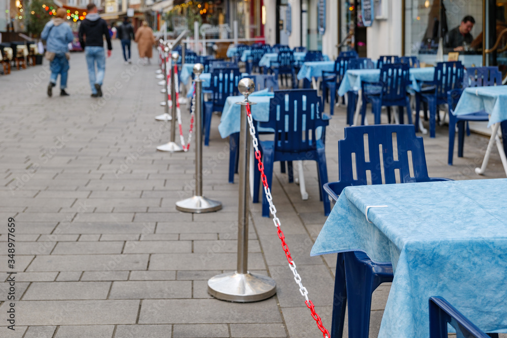 Selected focus at vacant outdoor tables and seats area of restaurant without customer during social distancing and global quarantine from epidemic of COVID-19 virus. Impact of COVID-19 at restaurant.