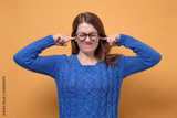 Young female in glasses having discontent look plugging her ears being annoyed with noise