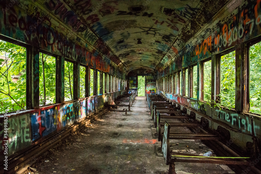 An abandoned train with graffiti