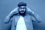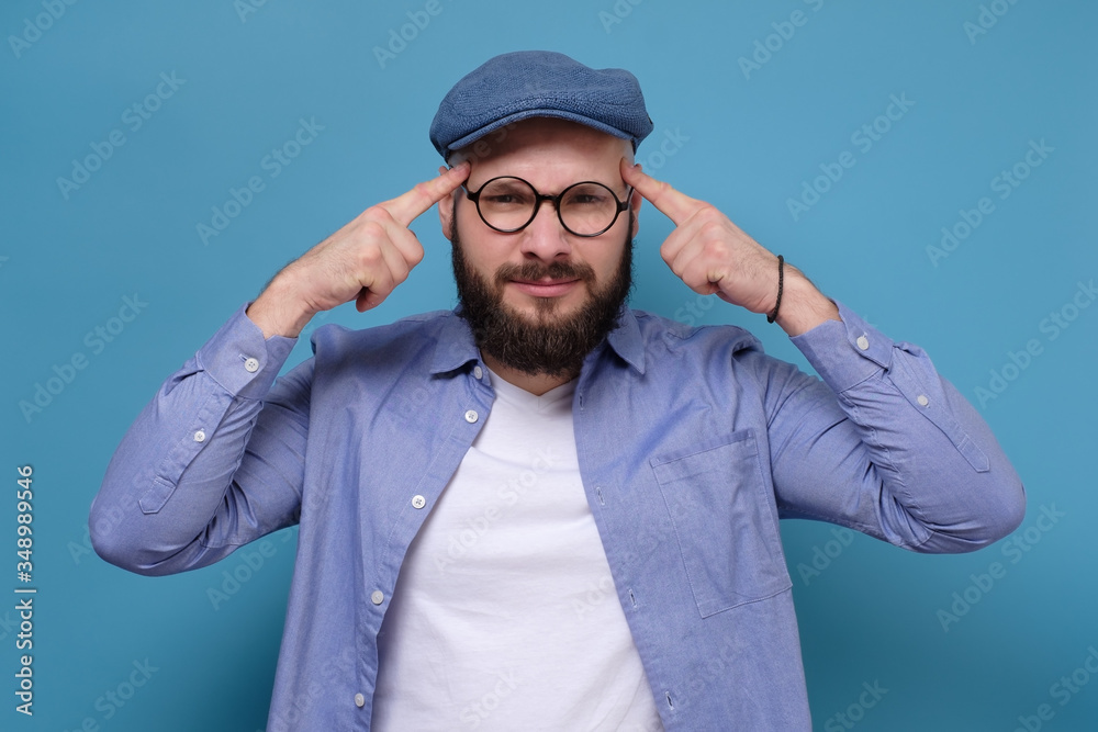 Young caucasian male keeps fingers on temples, selects best suitable solution