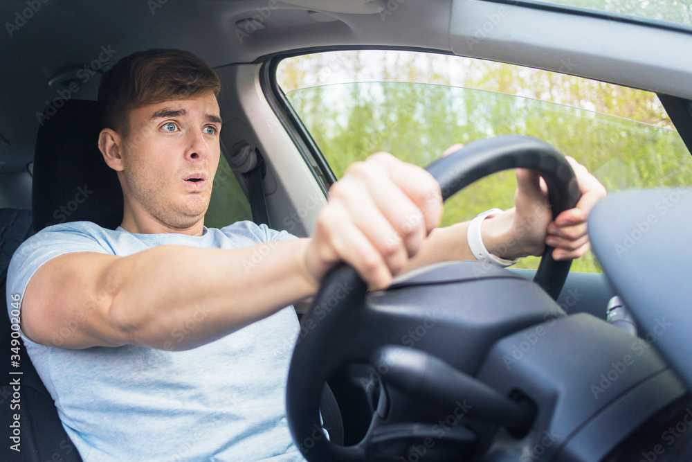 Handsome frightened fearful guy, driver, young scared man shocked about to have traffic accident, driving car on road holding steering wheel of automobile. Unfastened by a seat belt. Traffic violation