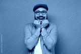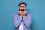 Excited caucasian man with glasses and blue hat being excited receiving great news