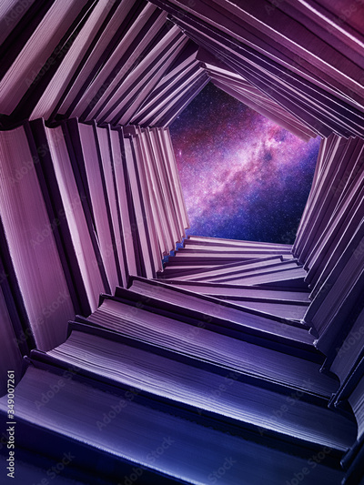 A well made of books with a starry sky above it
