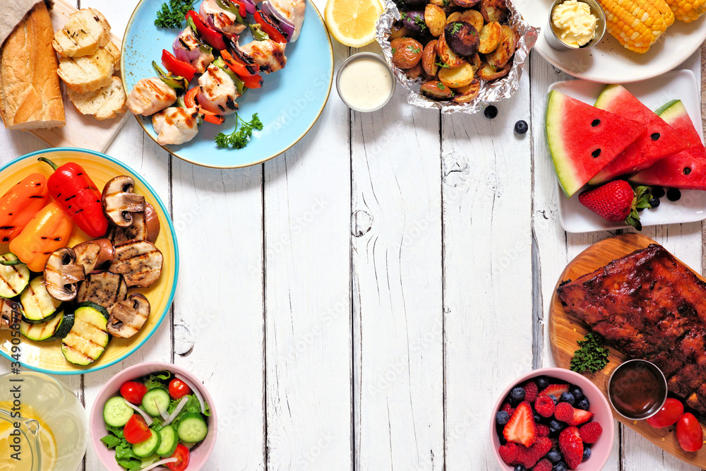 Summer BBQ or picnic food frame. Variety of grilled meats, vegetables, fruits, salad and potatoes. Above view over a white wood background. Copy space.