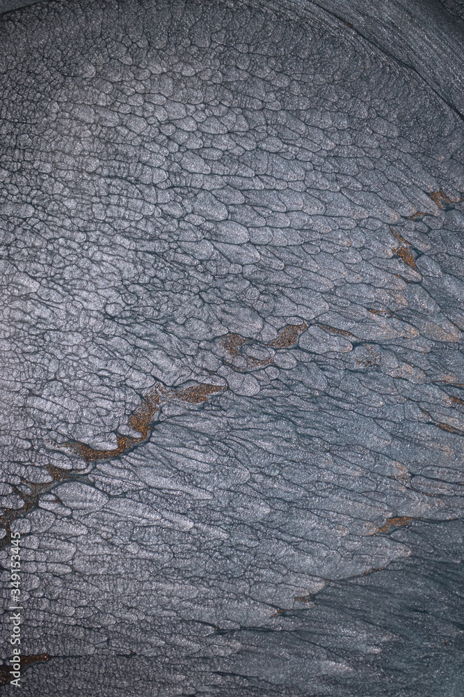 Macro photography of the dramatic black, monochrome abstraction, reminiscent of dragon scales or caked lava, shimmering with dark gray, silver and bronze accents. Alcoholic ink is mixed together.