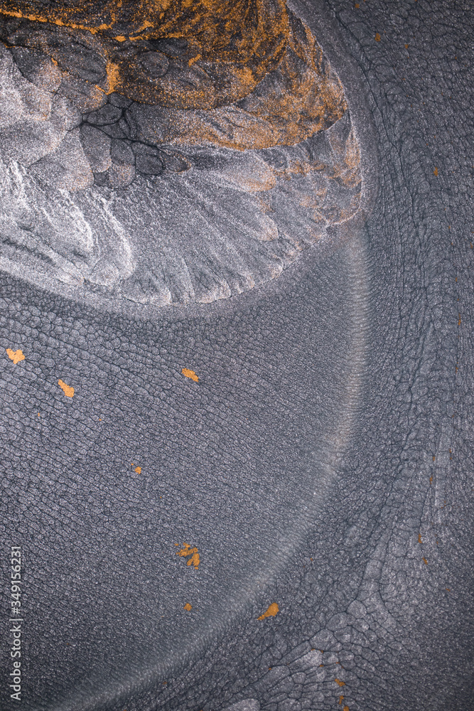 Macro photography of the dramatic black, monochrome abstraction, reminiscent of dragon scales or caked lava, shimmering with dark gray, silver and bronze accents. Alcoholic ink is mixed together.