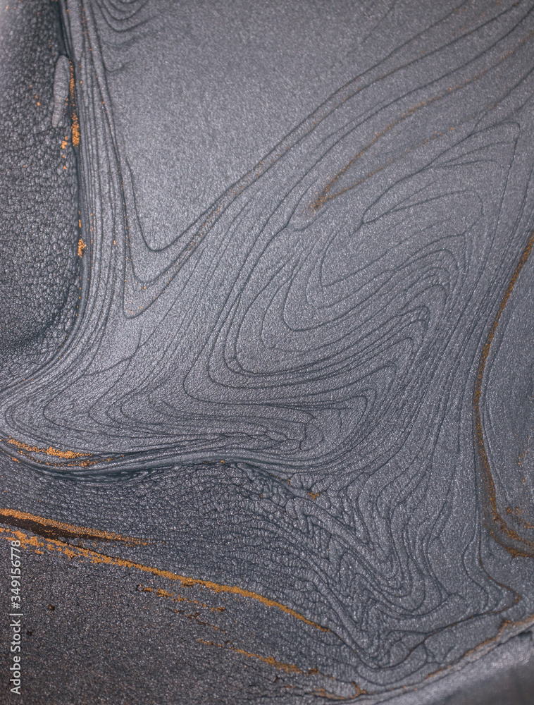Macro photography of the dramatic black, monochrome abstraction, reminiscent of dragon scales or caked lava, shimmering with dark gray, silver and bronze accents. Alcoholic ink is mixed together.