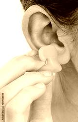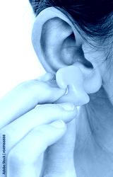 Individual earplugs for children. Girl holding individual earplug near ear, close-up.