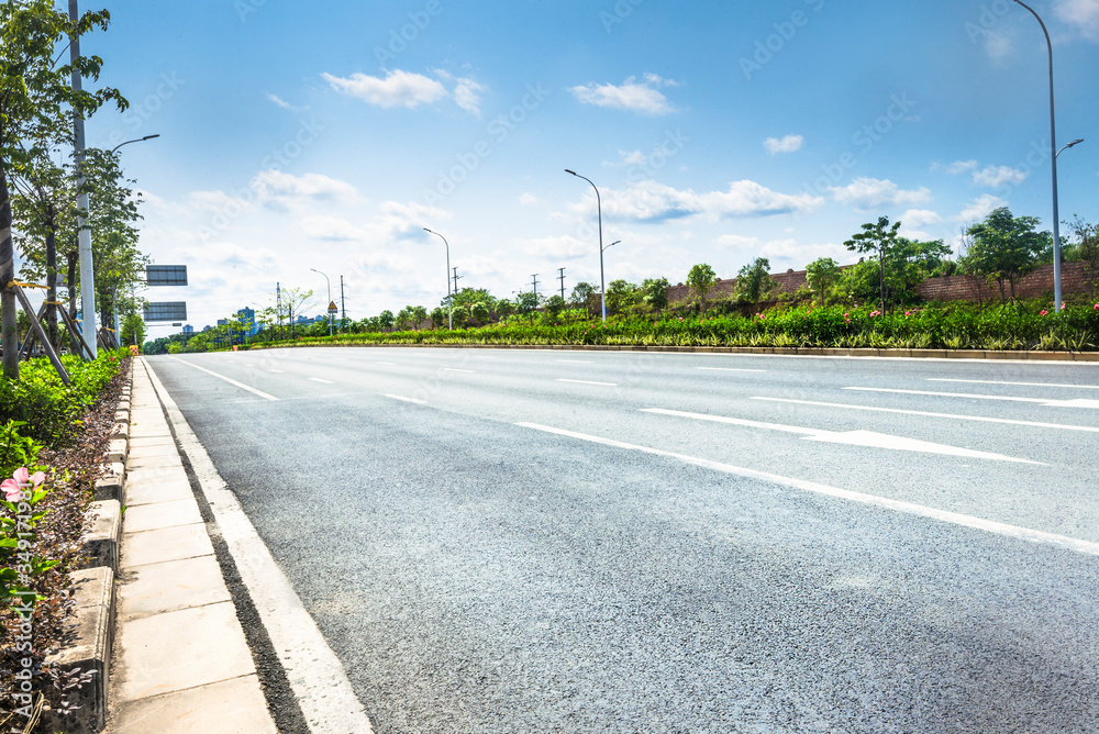 Under the blue sky, there is no car asphalt road on the outskirts of town.