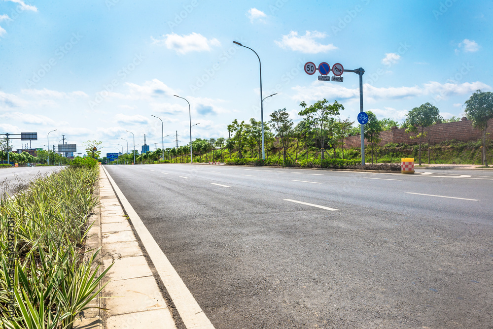 Under the blue sky, there is no car asphalt road on the outskirts of town.