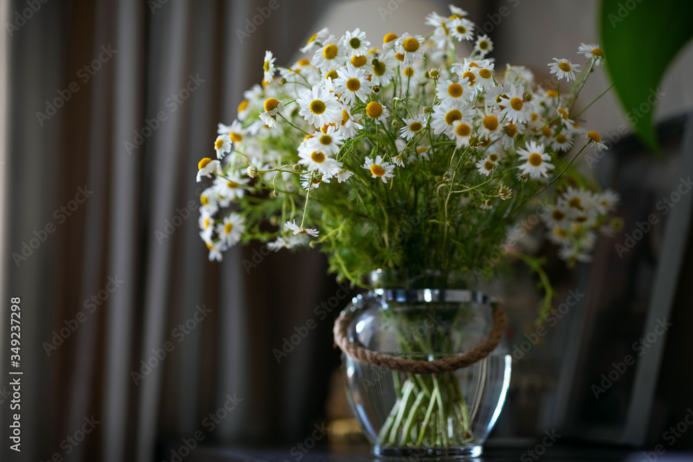 Summer composition of a bouquet of field daisies in a glass vase, on the background of beige curtains, natural lighting. The concept of a holiday and home comfort. Selective focus.