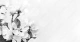 Blooming white branch in spring on creamy bokeh background . Spring border, web banner, background. Copy space.