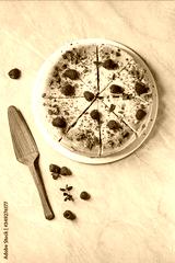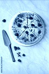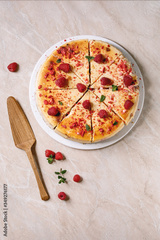 Homemade raspberry baked cheesecake sliced on plate decorated by fresh raspberries, mint and wooden cake server over pink marble background. Flat lay, space