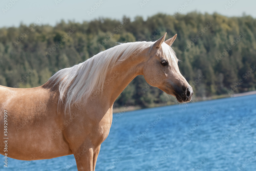 Portrait of a beautiful palomino horse on natural summer background near a river, head closeup