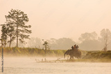 Chitwan National Park, Nepal - November 21, 2017. Tourists on elephants having a safari journey in the morning. Crossing the river with fog.