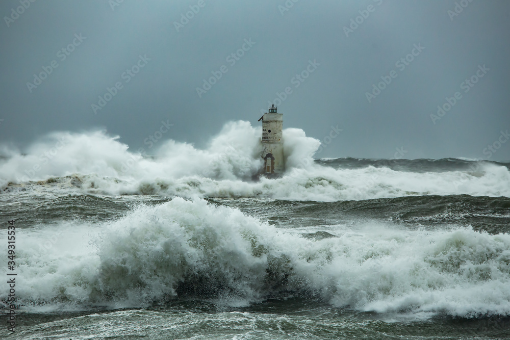 The lighthouse of the Mangiabarche shrouded by the waves of a mistral wind storm