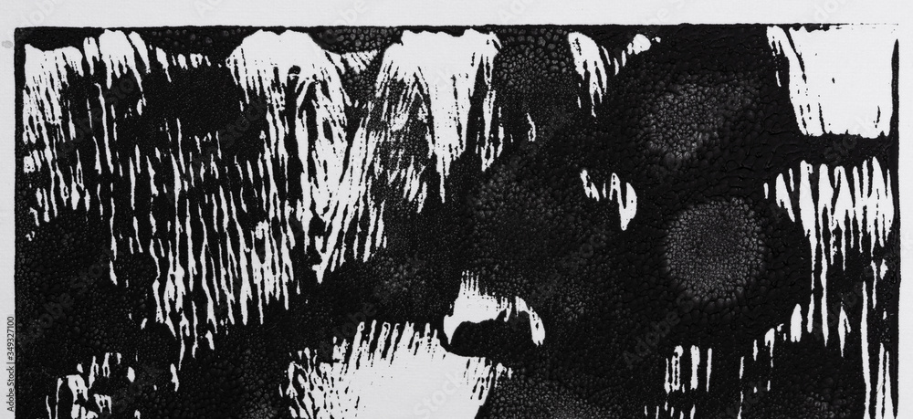 real macro photo of black lino ink remain coming from paint roller on white paper background.