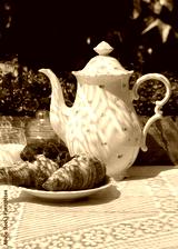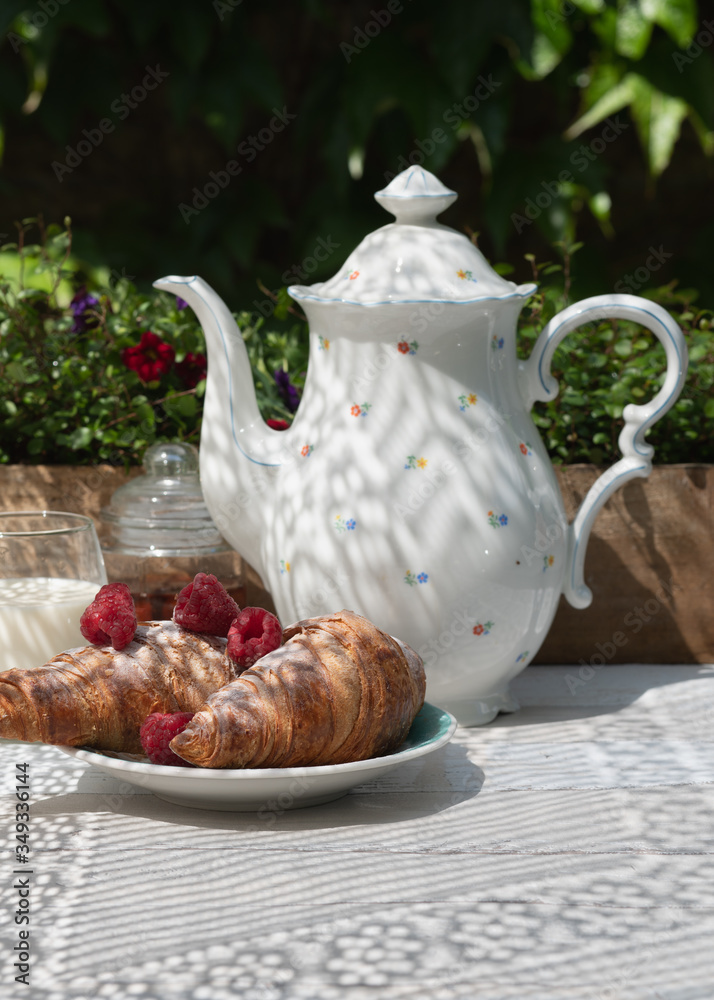Romantic summer breakfast in the garden. Sunny morning. Table with coffee pot, french crusty croissants, fresh raspberries milk and jam. Delicious start of the day.