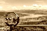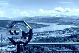 Panoramic view of Zurich lake and Alps from the top of Uetliberg mountain, from the observation platform on tower on Mt. Uetliberg, Switzerland, Europe