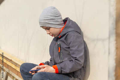 A European boy, a teenager in a blue jacket, writes a text message on his mobile phone in spring or autumn.