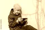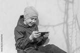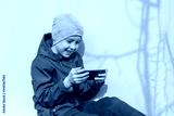 A person is playing a game on their blue smartphone. A teenager smiles and laughs in the street.