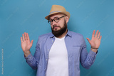 Man in summer hat and glasses keeping hands in stop gesture saying it was not me.