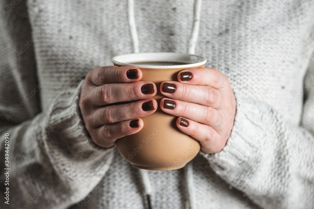 A woman wearing in a light cozy sweater is holding a cup of aromatic black coffee. The nails are coated with brown nail polish. Concept of coffee manicure.