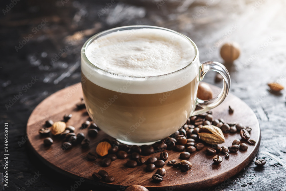 Aromatic delicious latte in a transparent Cup on a brown wooden tray. There are coffee beans and nuts nearby. Breakfast or a coffee break in a cozy cafe
