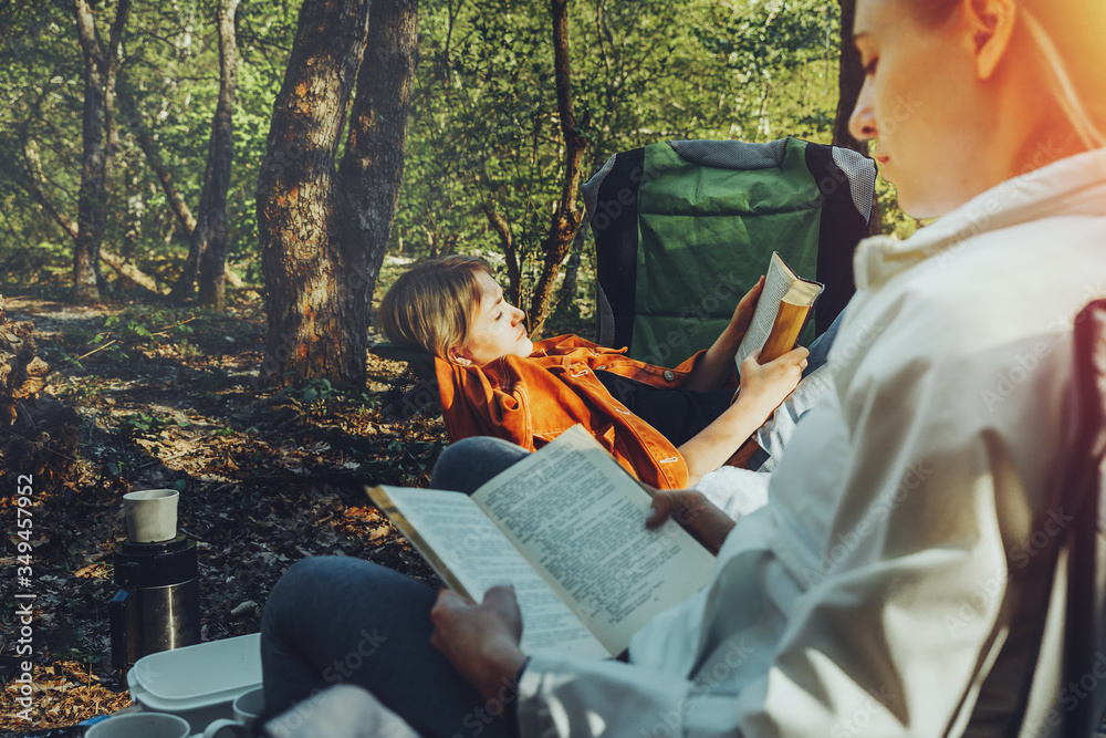 Two young girls relax on camping and read books