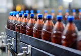 industrial food production of beer. Plastic beer bottles on a conveyor belt in the background of a brewery