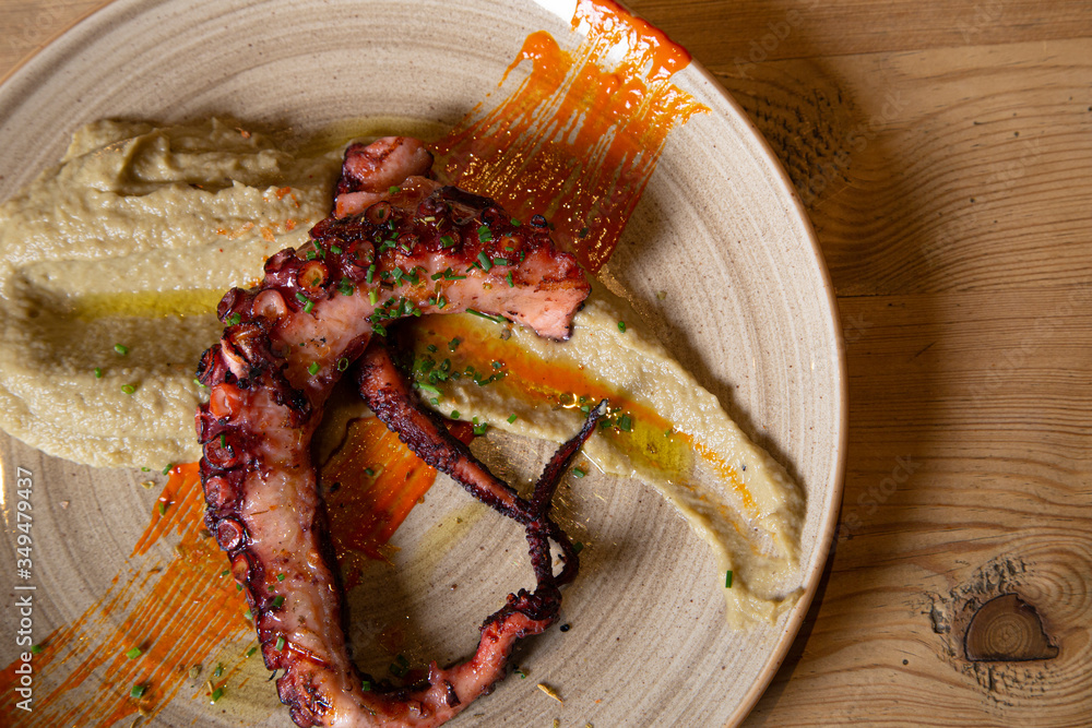Grilled octopus with smoked aubergine on a ceramic plate. Signature cuisine. Isolated image.
